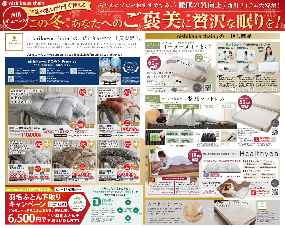 快眠のためには、寝具選びが重要です。・・・・・質の高い睡眠をとるためには、自分に合った寝具を選ぶことがとても大切です。寝具選びの基本は、睡眠中からだの生理的変化に対応してくれる寝具を選ぶこと。すなわち、体温の変化に対して大切な温度を保つ保温性、適切な湿度を保つ保湿性、吸った湿気を空気中に発散させる放湿性に優れた寝具を選ぶことが、快適な眠りのための最重要条件になります。理想的な寝床内気象を維持するための寝具は、季節によっても変わります。四季に応じて寝具を組み合わせて一年中質の高い睡眠をとりましょう。本年創業458年を迎えた日本一の寝具メーカー東京・西川の豊富な商品から、あなたに合った逸品をご提案いたします。