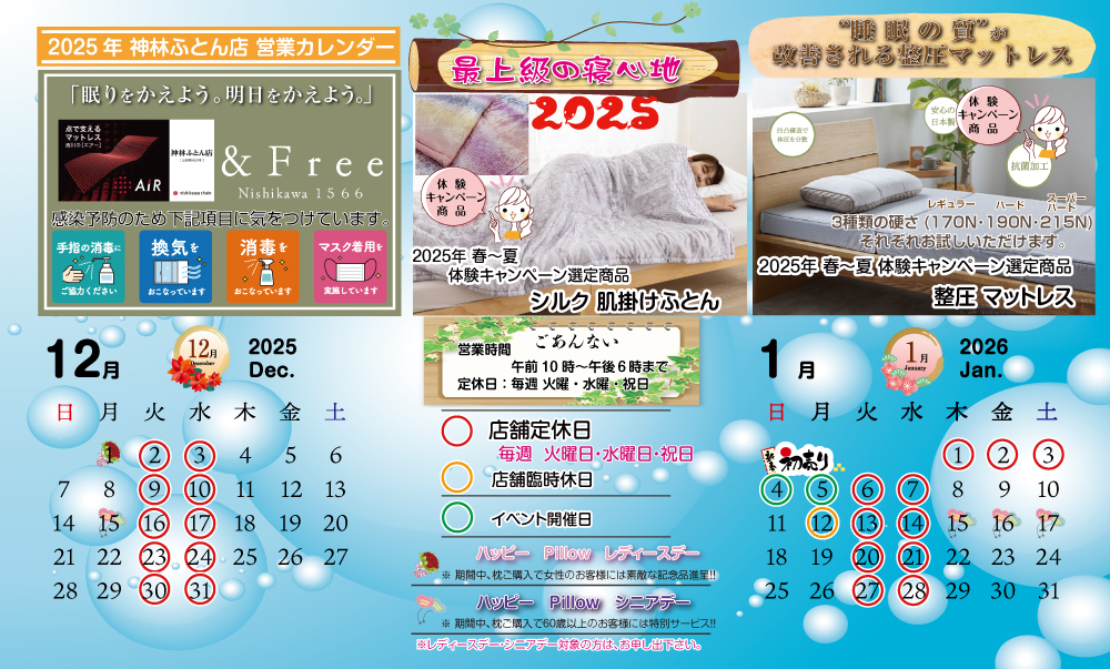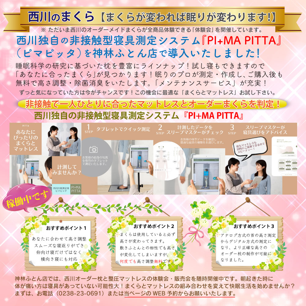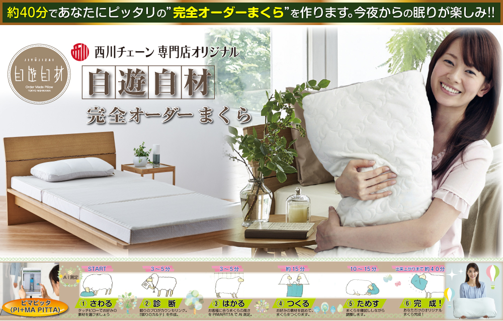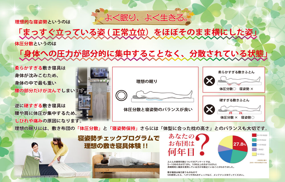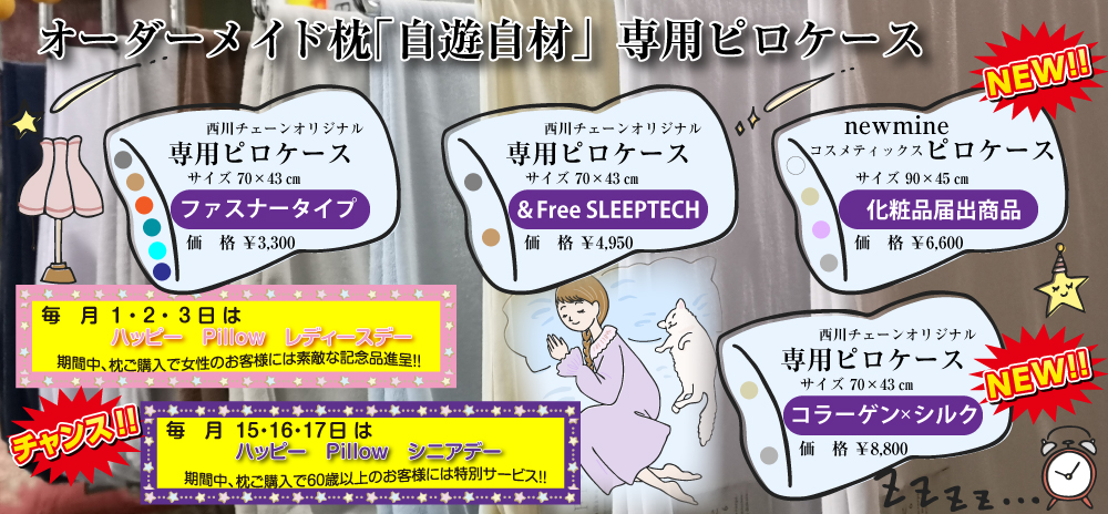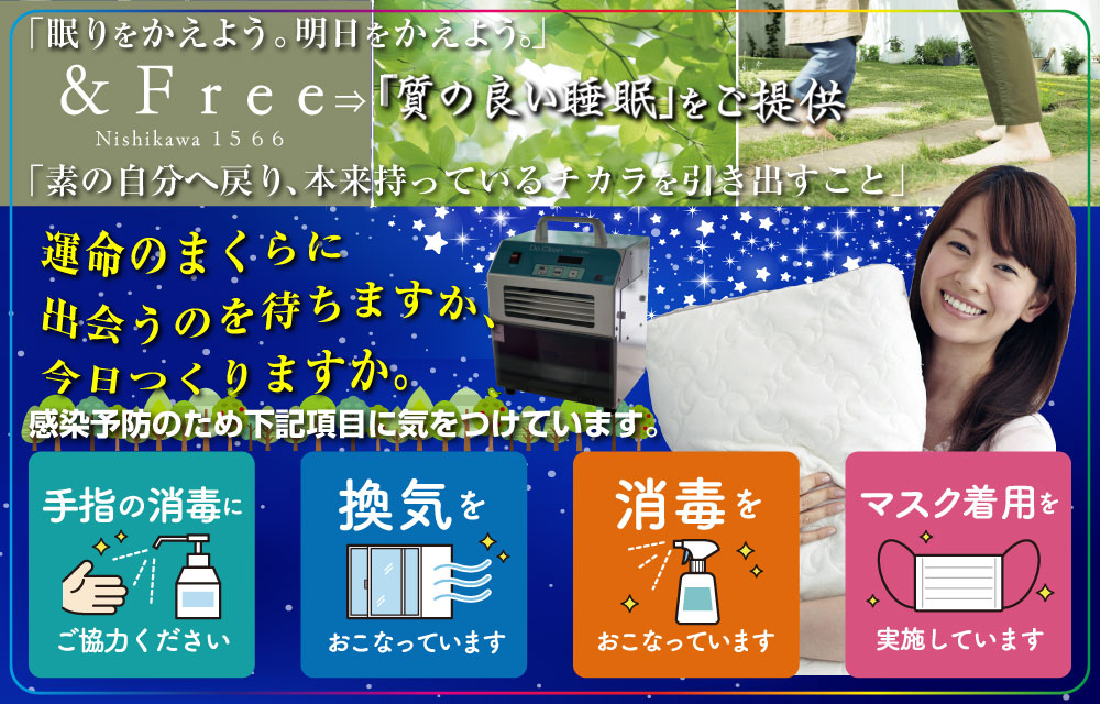 快眠のためには、寝具選びが重要です。・・・・・質の高い睡眠をとるためには、自分に合った寝具を選ぶことがとても大切です。寝具選びの基本は、睡眠中からだの生理的変化に対応してくれる寝具を選ぶこと。すなわち、体温の変化に対して大切な温度を保つ保温性、適切な湿度を保つ保湿性、吸った湿気を空気中に発散させる放湿性に優れた寝具を選ぶことが、快適な眠りのための最重要条件になります。理想的な寝床内気象を維持するための寝具は、季節によっても変わります。四季に応じて寝具を組み合わせて一年中質の高い睡眠をとりましょう。本年創業458年を迎えた日本一の寝具メーカー東京・西川の豊富な商品から、あなたに合った逸品をご提案いたします。
