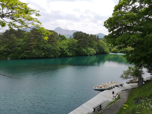 五色沼で最大の毘沙門沼、後ろに宝の山「会津磐梯山」が位置してます。