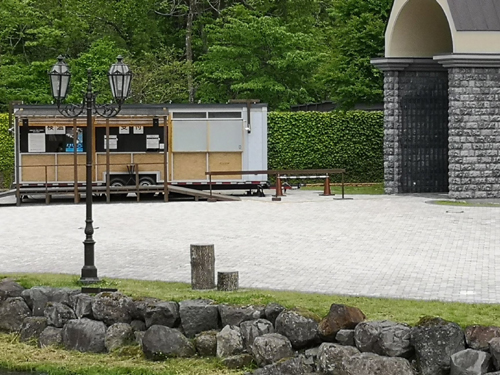 コロナ感染症予防:美術館入り口の前に検温所と券売所が設けられていました